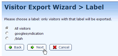 7. On the Visitor Export Wizard > Label page, follow the instruction to choose a label or All visitors, and then click the Next button.
